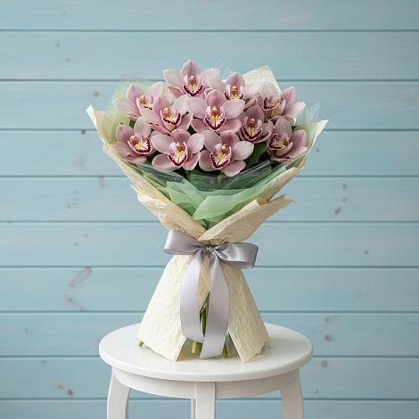 Этот роскошный букет из нежных розовых орхидей cymbidium поражает своей изысканностью и утонченностью. Элегантные цветы с тёплыми бежево-розовыми лепестками и аккуратным бордовым акцентом в центре словно созданы для того, чтобы дарить радость и восхищение. Композиция оформлена в воздушную упаковку пастельных оттенков и перевязана благородной серебристой лентой, что придаёт букету особую торжественность и гармонию. Идеальный выбор для особого случая, когда хочется выразить самые тёплые чувства и оставить незабываемое впечатление.
